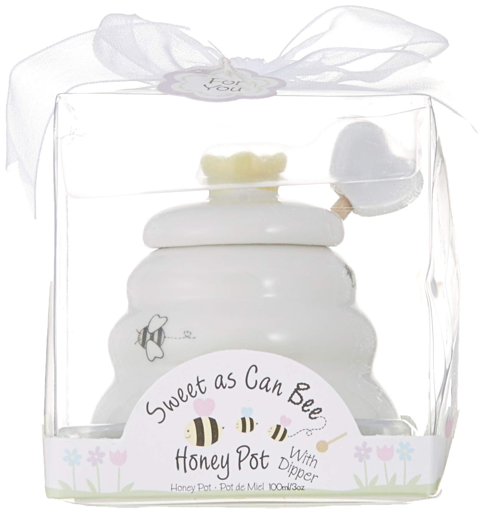 The honey pot presented with a glorious garden of pastel purple, pink and blue flowers at the bottom, highlighted by an enamored bee couple amid the words meant to bee and honey pot with dipper. It is decorated with a bumble bee and the phrase tasty & sweet. Adorable gift packaging features colorful flowers and bees, the honey pot itself is adorned with little bees, and is. Purple, pink and blue flowers at the base, a mama bee and a baby bee with tiny hearts for wings at the front of the base along with the words sweet as can bee honey pot with dipper , and.
